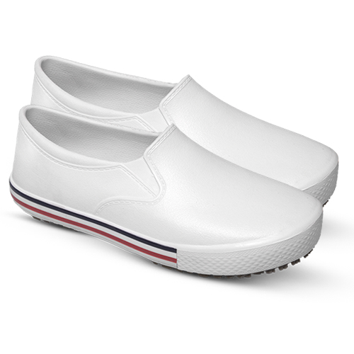 Calçado ocupacional de uso profissional tipo tênis, fechado na parte do calcanhar e na parte superior, confeccionado em EVA, solado de borracha antiderrapante, contém antimicrobiano que atenua o odor nos pés.